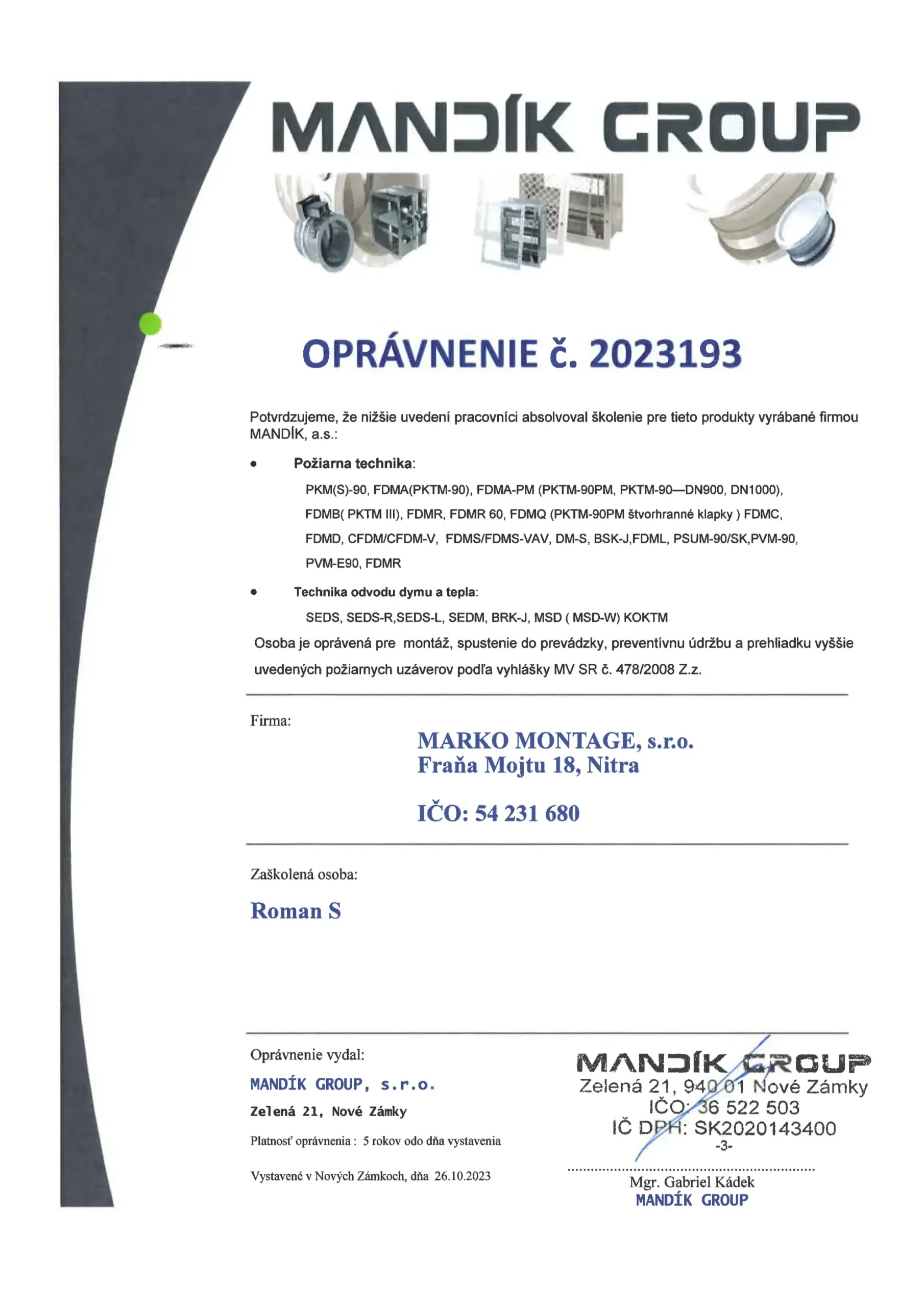 Oprávnenia pre inštalácie, spustenie do prevádzky a preventívnu údržbu požiarných uzáverov.